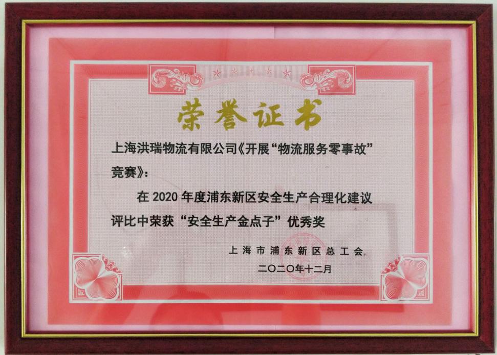 ——2020年12月,在參加上海市浦東新區(qū)安全生產(chǎn)合理化建議評比中,公司工會提交的《開展“物流服務(wù)零事故”競賽》建議獲得“安全生產(chǎn)金點子”優(yōu)秀獎。